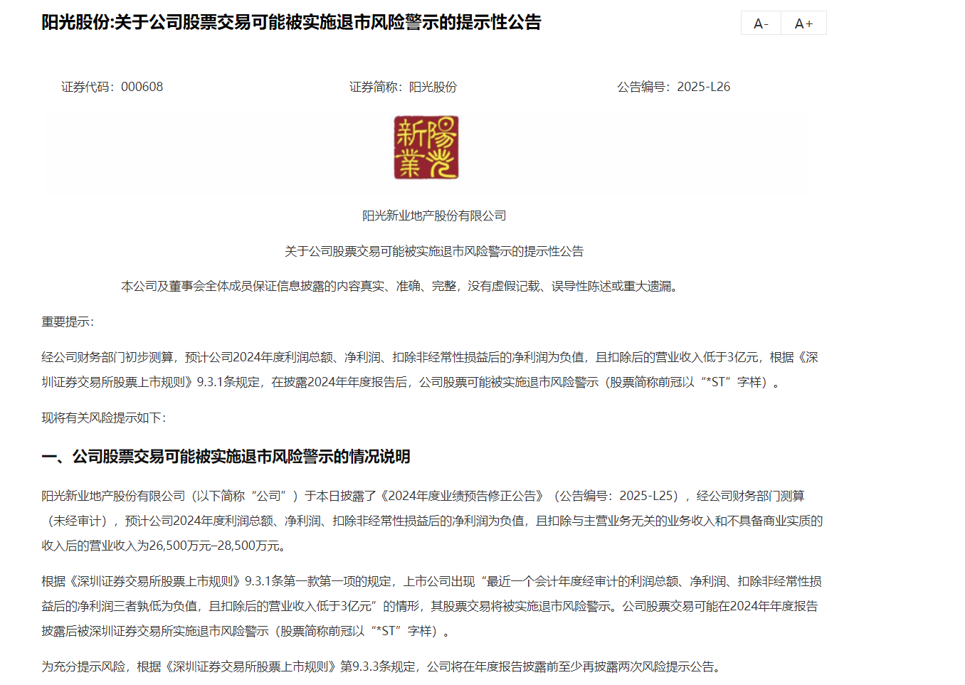 3月22日,阳关股份发布公告披露,经公司财务部门初步测算,预计公司2024年度利润总额、净利润、扣除非经常性损益后的净利润为负值,且扣除后的营业收入低于3亿元,根据《深圳证券交易所股票上市规则》9.3.1条规定,在披露2024年年度报告后,公司股票可能被实施退市风险警示(股票简称前冠以“*ST”字样)。