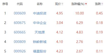其中,中迪投资、中华企业、天地源、铁岭新城、福星股份位列板块涨幅前五位,涨幅分别为10.00%、6.29%、4.83%、2.76%、2.67%。