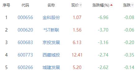 金科股份、*ST新联、京投发展、西藏城投、城建发展位列涨幅榜后五位,涨幅分别为-6.96%、-3.70%、-3.16%、-2.74%、-2.62%。