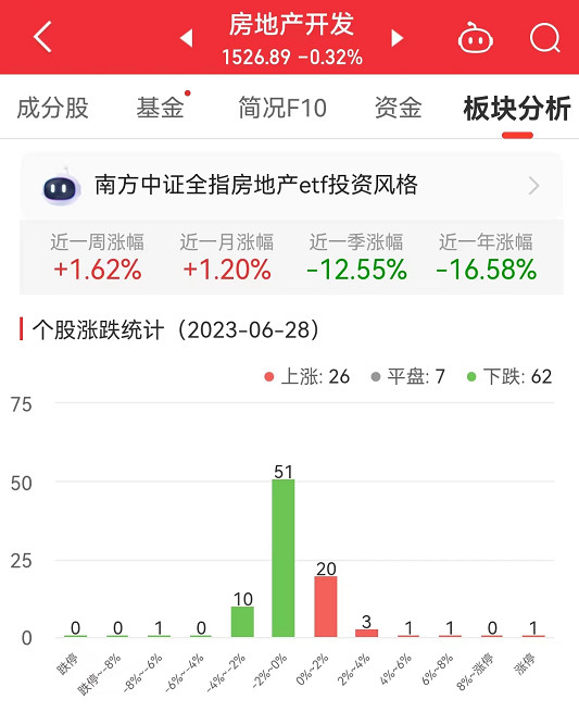 今日,房地产开发板块整体跌幅0.32%,其中,26只股票上涨,7只股票平盘,62只股票下跌。