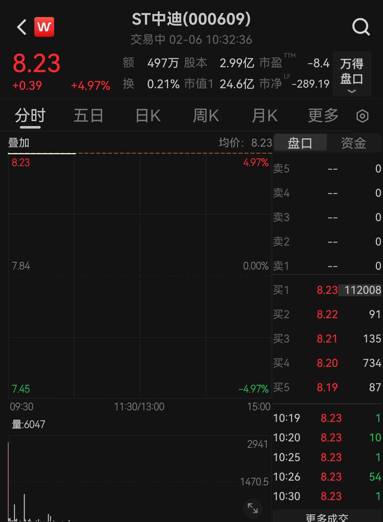 2月6日开盘后,ST中迪“一字板”涨停。这也是该股连续两天涨停。