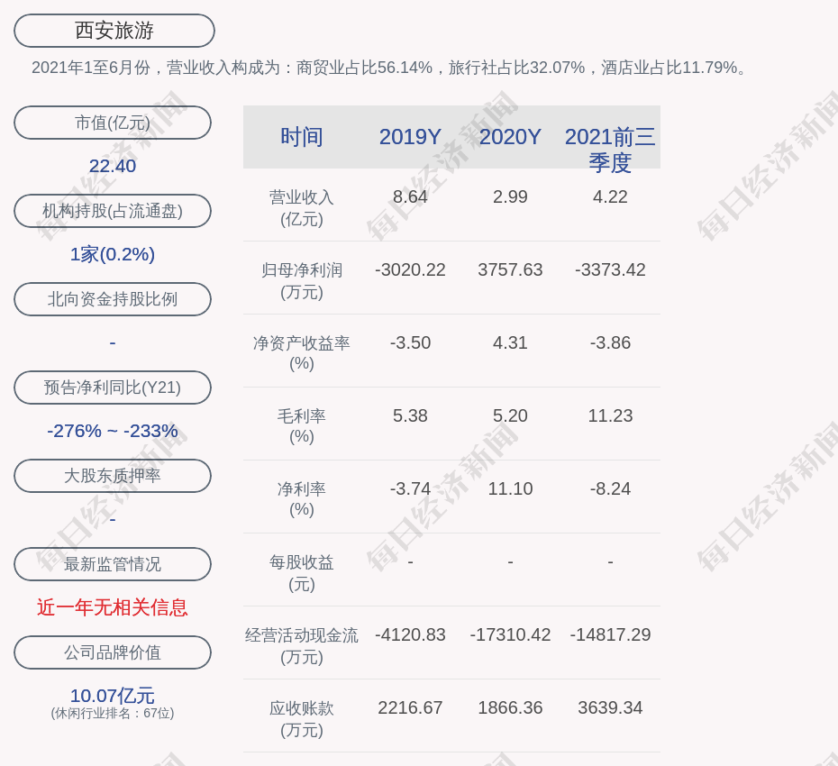 2021年1至6月份,西安旅游的营业收入构成为:商贸业占比56.14%,旅行社占比32.07%,酒店业占比11.79%。