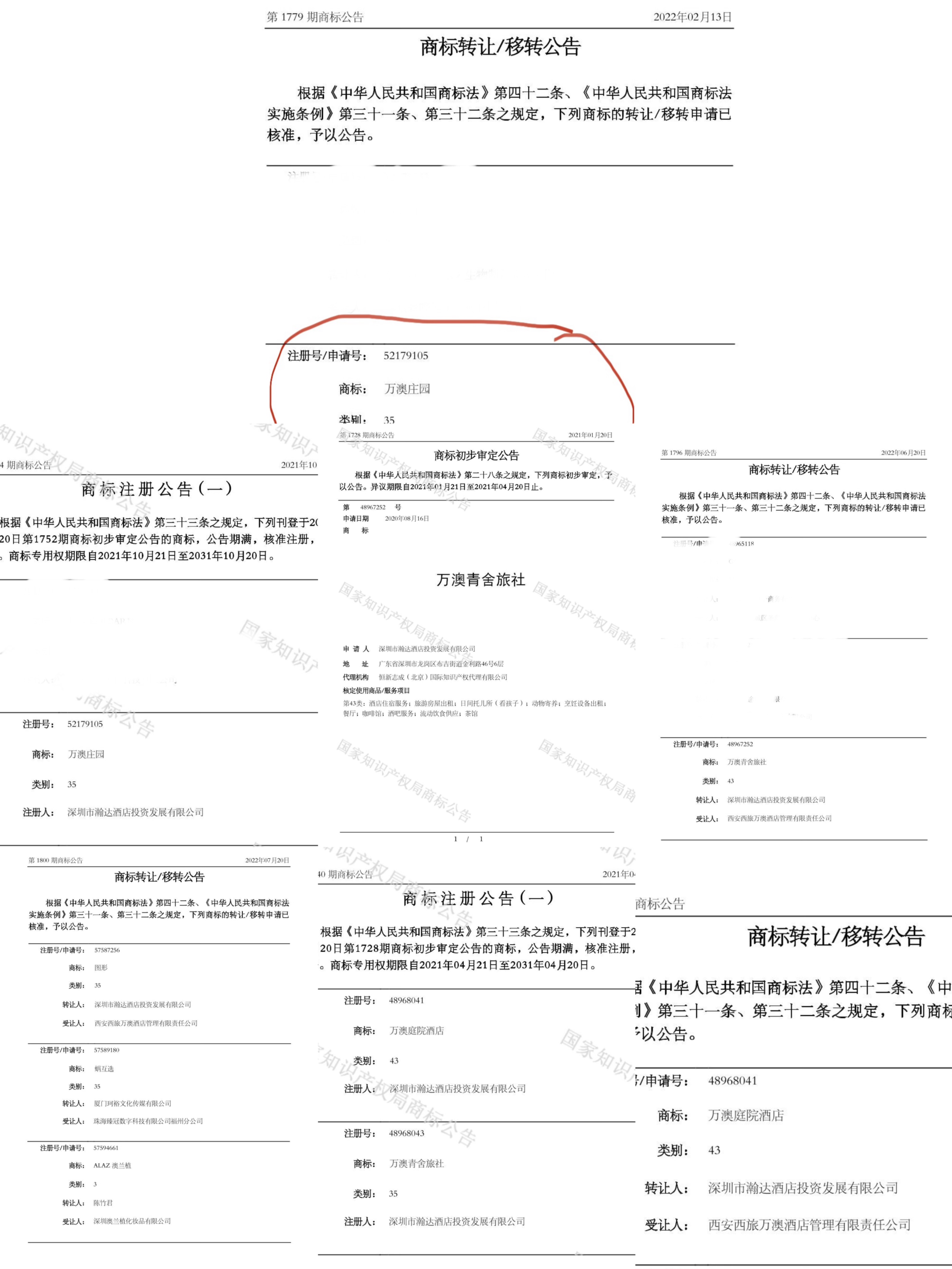 据中国商标网公示信息,2019年3月,深圳市瀚达酒店投资发展有限公司(简称“深圳瀚达”)申请注册“万澳酒店”商标(以下均指43类、35类),2019年7月申请注册“铂金万澳”,这两个商标均在当年获准申请后注册发文。