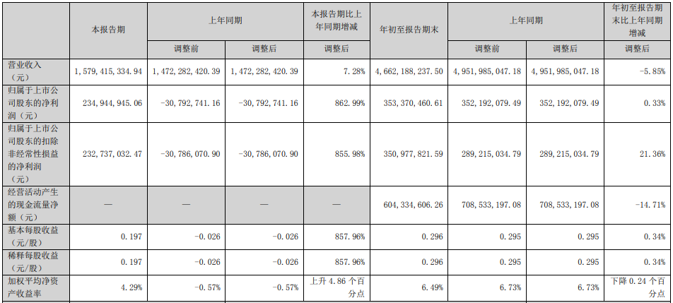 第三季度归属于上市公司股东的净利润2.35亿元,上年同期净亏损3079.27万元,同比增长862.99%;营业收入15.79亿元,同比增长7.28%。