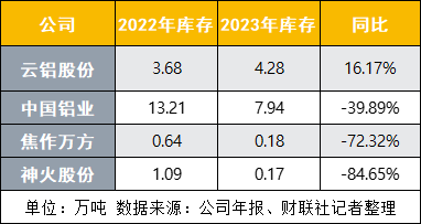 在去年电解铝行业利润走扩的同时,电解铝企也加大了出货力度。据目前已公布年报的铝企来看。库存方面,去年除了云铝股份(000807.SZ)增加16.17%外,中国铝业(601600.SH)、焦作万方、神火股份(000933.SZ)都在大幅去库,2023年库存分别较上一年减少39.89%、72.32%、84.65%。