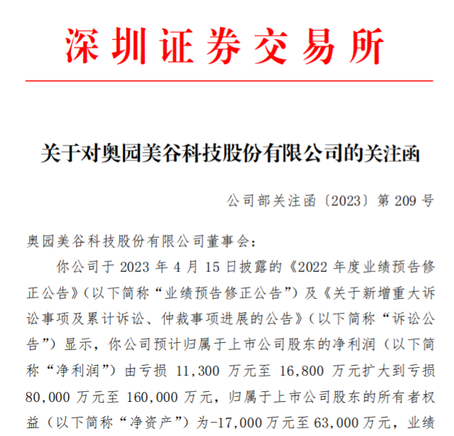 4月19日,深圳证券交易所发布关于对奥园美谷科技股份有限公司的关注函,要求奥园美谷就“预计计提负债金额是否合理、合规”、“公司持续经营能力及持续盈利能力是否存在重大不确定性”等方面进行说明。