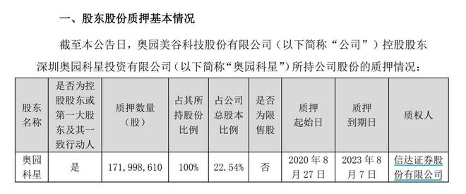 同日,*ST美谷发布关于控股股东质押情况的进展公告称,截至本公告日,深圳奥园科星投资有限公司(奥园科星)质押公司股份171998610股,占其所持股份比例100%,占公司总股本比例22.54%,质押起始日2020年8月27日,质押到期日2023年8月7日,质权人为信达证券股份有限公司。