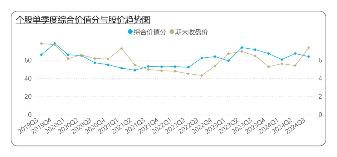 拉长时间看,以五年为周期(从2019Q2~2024Q2季度,下同),中油资本的综合价值分有较大波动,而股价走势较综合价值有所滞后。因此我们倾向于认为近期中油资本的股价飙升,除了部分缘于牛市带来的“水涨船高”外,更多的是对前几个季度综合价值的回归。