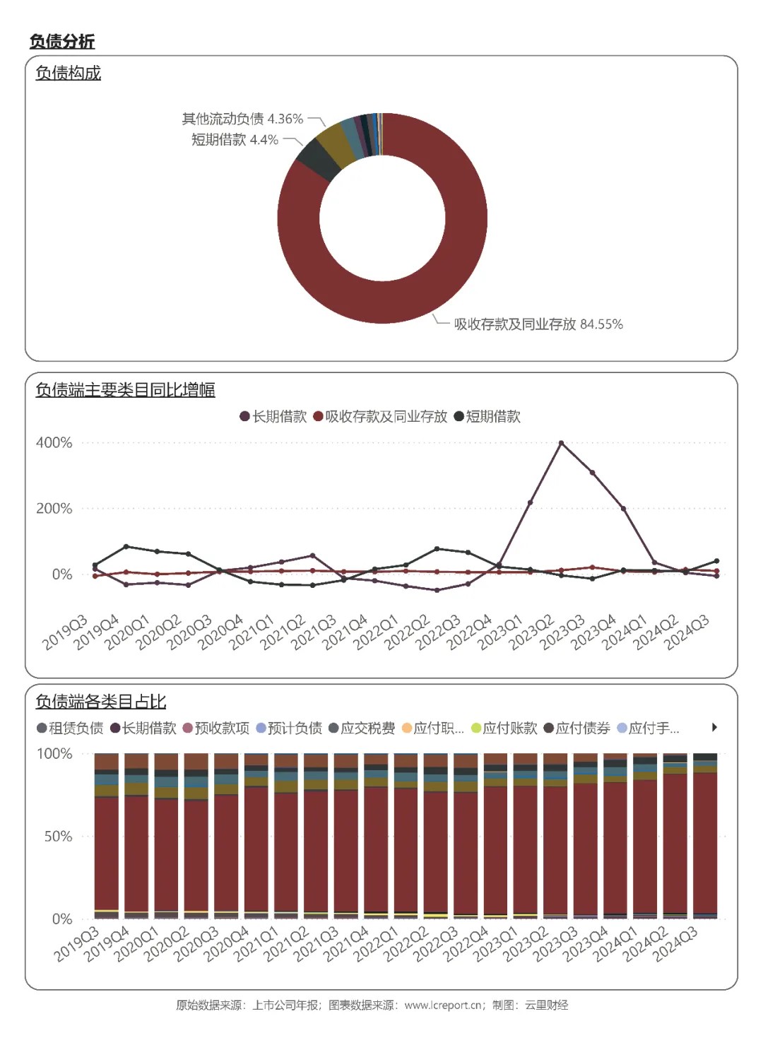 在负债端,中油资本的主要负债包括吸收存款及同业存放(占比84.55 %)、短期借款(占比4.40 %),以及其他流动负债(占比4.36 %),其中核心负债项目吸收存款及同业存放同比增幅为9.12 %。