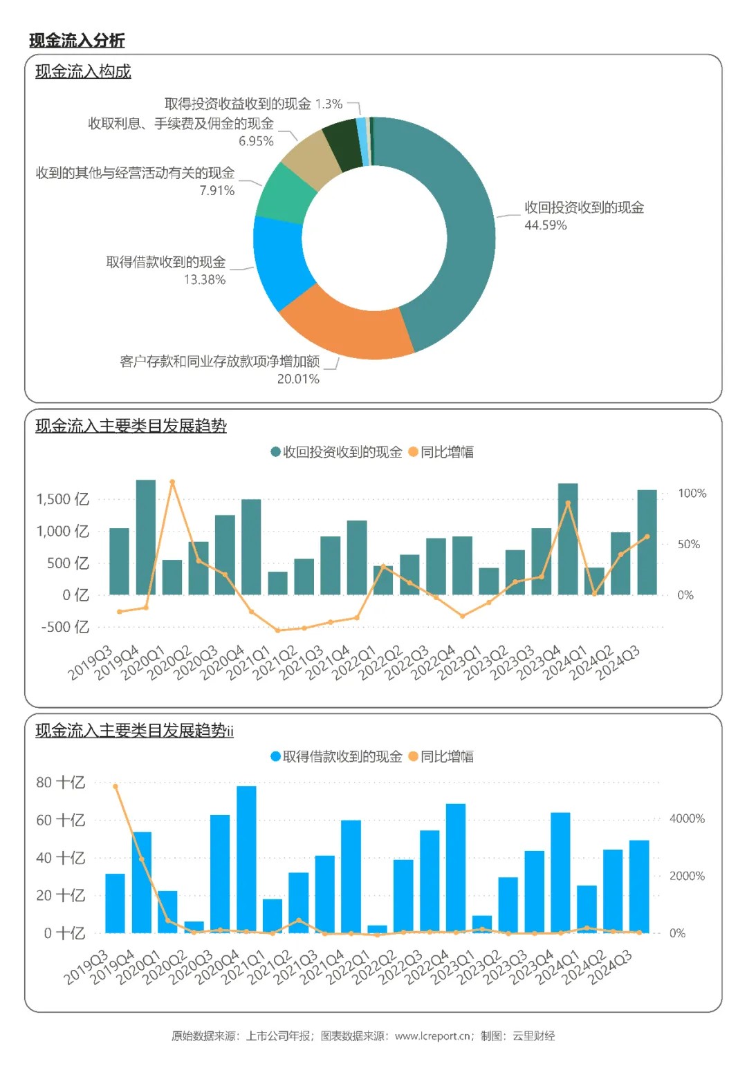 中油资本的主要现金流入为收回投资收到的现金(占比44.59 %)、客户存款和同业存放款项净增加额(占比20.01 %),以及取得借款收到的现金(占比13.38 %)。核心现金流入项——收回投资收到的现金,同比增幅为57.14 %。