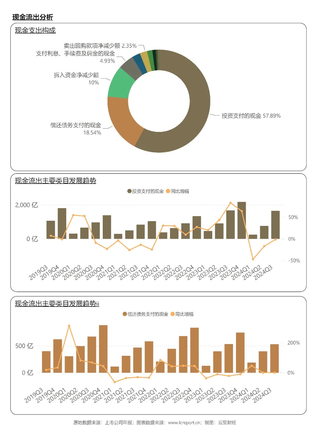 中油资本的现金流出主要是投资支付的现金(占比57.89 %)、偿还债务支付的现金(占比18.54 %),以及拆入资金净减少额(占比10.00 %)。核心现金流出项——投资支付的现金,同比增幅为-1.37 %。