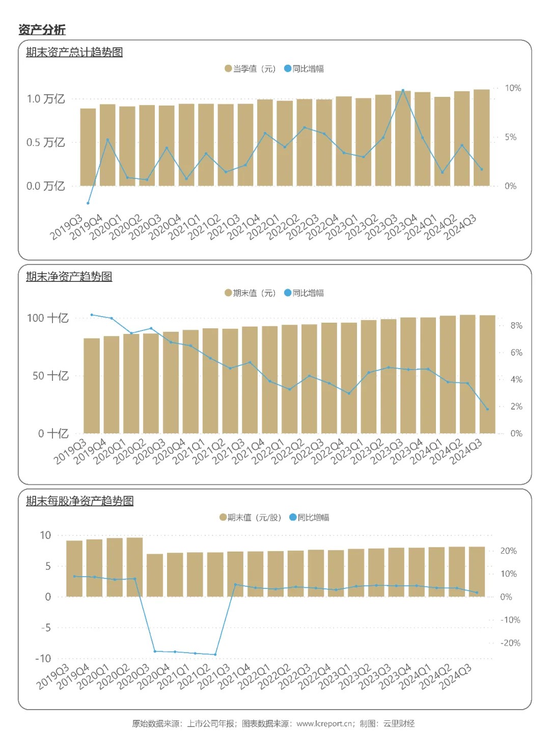 1)报告期营收增幅持续放缓,每股营收不及期初水平;2)扣非净利润录得负增长,每股扣非净利润额在周期内呈现持续下降的趋势;3)盈利质量不及券商亦不如银行;4)每股净资产在2020Q3季度出现断崖式下跌,尔后微幅增长,但每股净资产额依然不及期初水平;5)总资产负债率保持稳定,而滚动净资产收益率自2020Q3季度以后持续下滑,报告期滚动净资产收益率排在行业中下游;6)近期股价的上涨主要受市场行情转暖以及估值回升需求的推动。