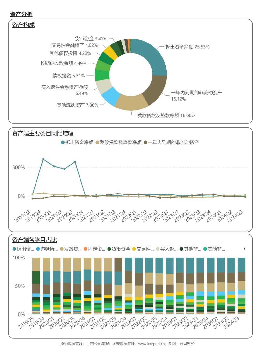 在资产端,中油资本的主要资产构成包括拆出资金净额(占比25.53 %)、一年内到期的非流动资产(占比16.12 %),以及发放贷款及垫款净额(占比16.06 %),其中核心资产项拆出资金净额同比增幅为-2.00 %。