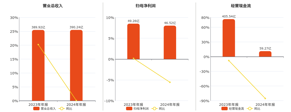 公司营业总收入为390.24亿元,较去年同报告期营业总收入增加3196.46万元,实现4年连续上涨,同比较去年同期上涨0.08%。归母净利润为46.52亿元,较去年同报告期归母净利润减少4.12亿元,同比较去年同期下降8.14%。经营活动现金净流入为59.27亿元,较去年同报告期经营活动现金净流入减少346.27亿元,同比较去年同期下降85.39%。