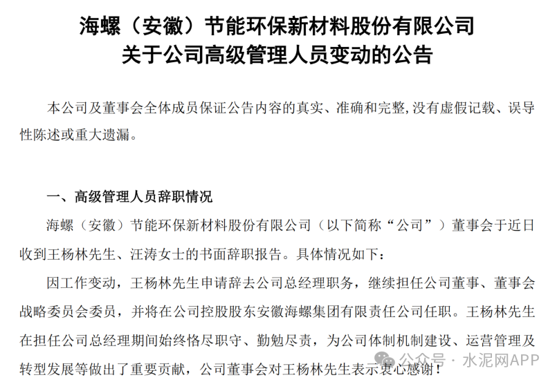 2月26日,海螺新材发布公告,因工作变动,王杨林先生申请辞去公司总经理职务,继续担任公司董事、董事会战略委员会委员,并将在公司控股股东安徽海螺集团有限责任公司任职。