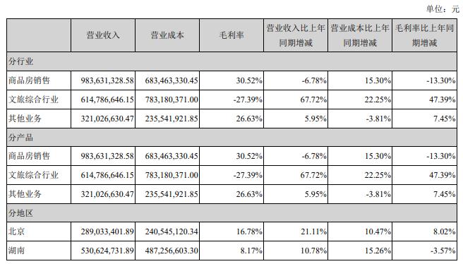 分行业来看,今年上半年,新华联商品房销售毛利率为30.52%,比上年同期减少13.3个百分点;文旅综合行业毛利率为-27.39%,比上年同期增长47.39个百分点;其他业务毛利率为26.63%,比上年同期增加7.45个百分点。分地区来看,北京毛利率16.78%,比上年同期增加8.02个百分点,湖南毛利率8.17%,比上年同期减少3.57个百分点。