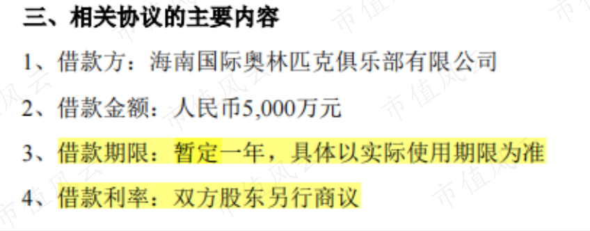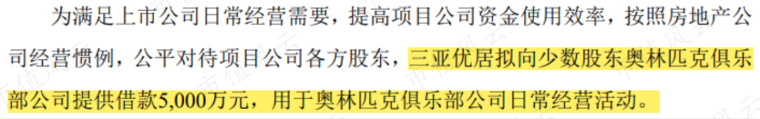 2021年7月,公司一则公告披露:子公司三亚优居提供借款5000万给少数股东海南国际奥林匹克俱乐部有限公司,用于少数股东日常经营活动。