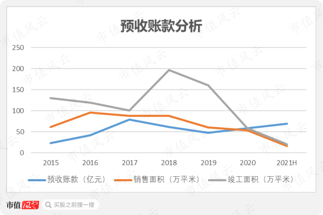 房地产公司的财务先行指标是“预收账款”,其逻辑是预售期房收款时该科目增加,交房结转收入时该科目减少(注:新准则下为“合同负债”科目)。2021年预收账款在销售惨淡的情况下,却并没有明显减少,唯一的解释是收入结转陷入停滞。