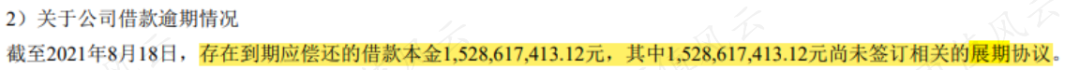 至于借款展期,根据2021年中年报的披露,截止今年8月,逾期借款本金15.3亿,均未签订展期协议。