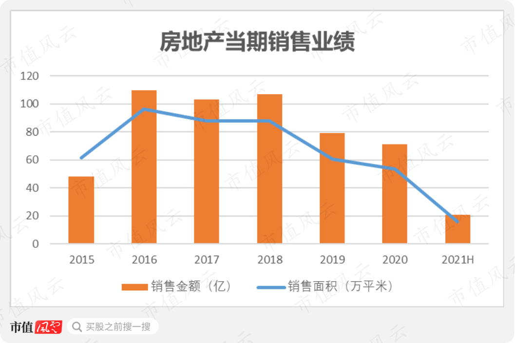 从销售面积与销售金额上看,公司从2018年开始销售额明显下跌。2021年中报销售面积仅16万平,销售金额仅21亿元,这个成绩只能用惨淡来形容。