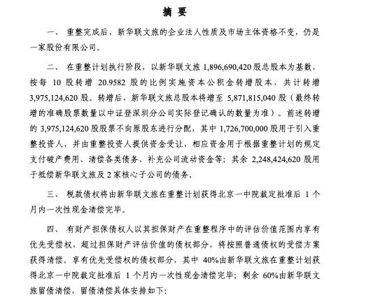 二、在重整计划执行阶段,以新华联文旅1,896,690,420股总股本为基数,按每10股转增20.9582股的比例实施资本公积金转增股本,共计转增3,975,124,620股。转增后,新华联文旅总股本将增至5,871,815,040股(最终转增的准确股票数量以中证登深圳分公司实际登记确认的数量为准)。前述转增的3,975,124,620股股票不向原股东进行分配,其中1,726,700,000股用于引入重整投资人,并由重整投资人提供资金受让,相应资金用于根据重整计划的规定支付破产费用、清偿各类债务、补充公司流动资金等;其余2,248,424,620股用于抵偿新华联文旅及2家核心子公司的债务。