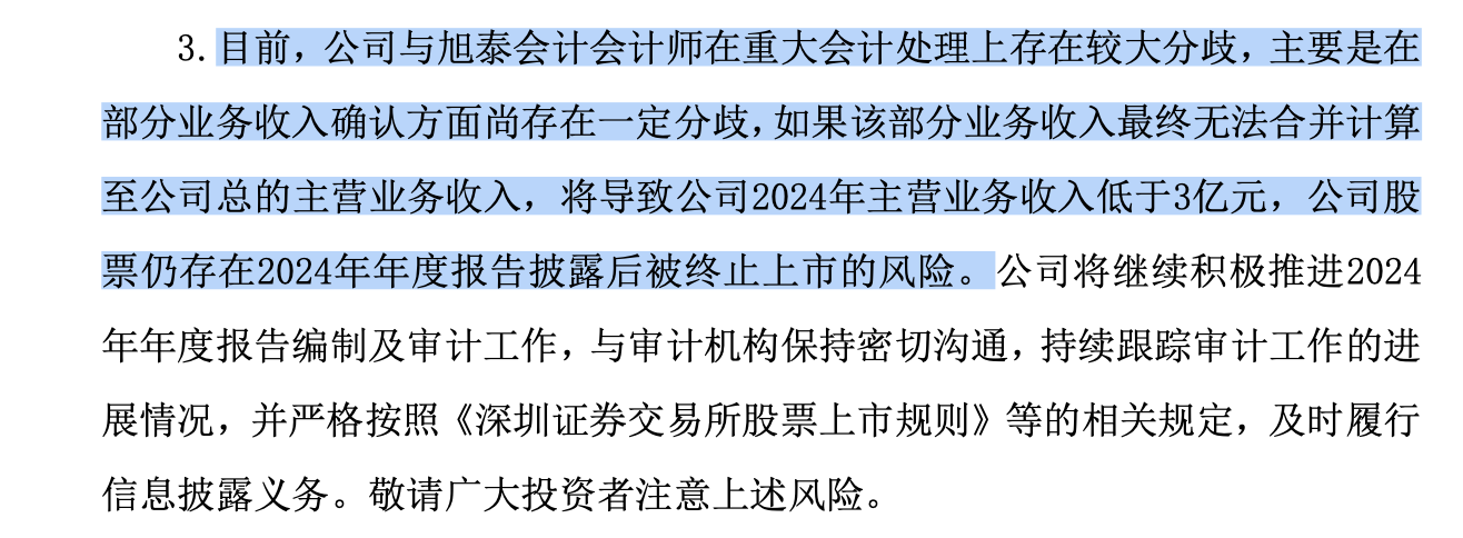 在此前的风险提示公告中,*ST恒立承认,公司与旭泰会所在重大会计处理上存在较大分歧,主要是在部分业务收入确认方面尚存在一定分歧,如果该部分业务收入最终无法合并计算至公司总的主营业务收入,将导致公司2024年主营业务收入低于3亿元,公司股票仍存在2024年年度报告披露后被终止上市的风险。
