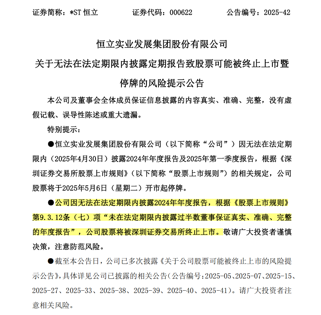 据此前公告,*ST恒立因无法在法定期限内披露2024年年度报告,根据《股票上市规则》第9.3.12条(七)项“未在法定期限内披露过半数董事保证真实、准确、完整的年度报告”,公司股票将被深圳证券交易所终止上市。