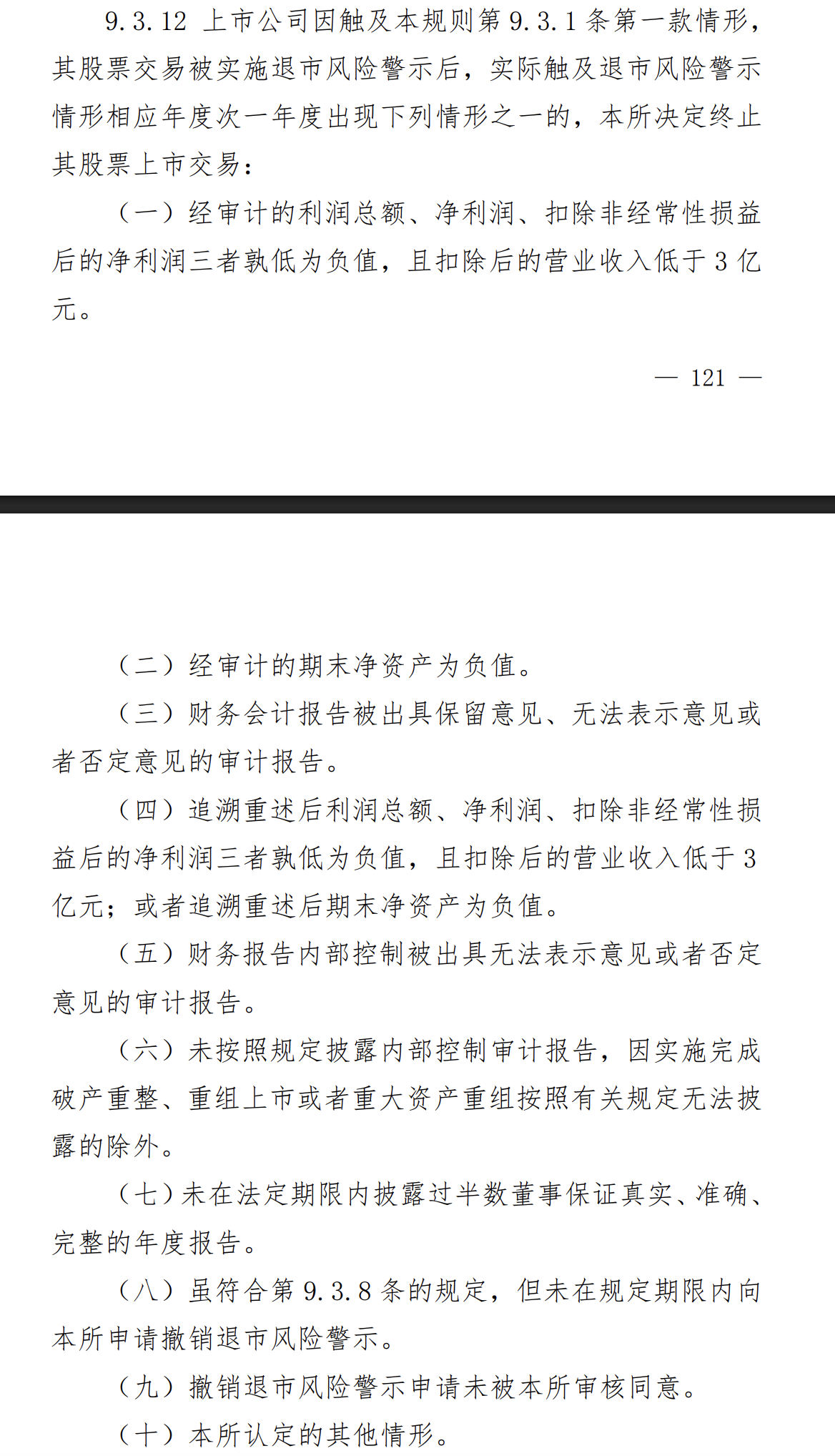 《股票上市规则》规定,上市公司因触及本规则第9.3.1条第一款情形,其股票交易被实施退市风险警示后,实际触及退市风险警示情形相应年度次一年度出现下列情形之一的,本所决定终止其股票上市交易:经审计的利润总额、净利润、扣除非经常性损益后的净利润三者孰低为负值,且扣除后的营业收入低于3亿元;财务会计报告被出具保留意见、无法表示意见或者否定意见的审计报告;未在法定期限内披露过半数董事保证真实、准确、完整的年度报告等等。