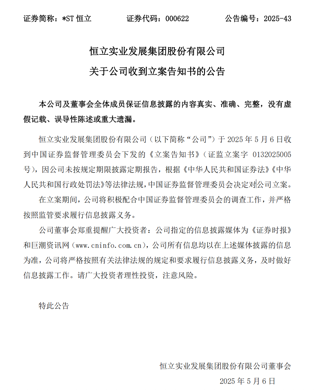 因无法按期披露2024年年报及2025年一季报,*ST恒立于5月6日开市起停牌。5月6日晚间,*ST恒立公告收到《立案告知书》,因公司未按规定期限披露定期报告,中国证监会决定对公司立案。