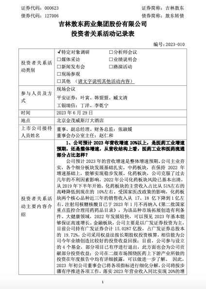 调研中,投资者还询问公司金融板块中,做为广发证券的第一大股东,广发证券股权投资来历及未来规划,是否会保持增持?公司主业未来是否聚焦中药部分?吉林敖东答复:广发证券为公司核心的优质资产,公司从1999年开始投资广发证券,2016年成为广发证券的第一大股东,之后的几个年度根据市场情况进行多次增持,增加核心优质资产持股比例。截至2023年3月31日,本公司持有广发证券境内上市内资股(A股)股份1,252,297,867股、境外上市外资股(H股)股份213,702,600股,以上持股占广发证券总股本的19.24%;本公司全资子公司敖东国际(香港)实业有限公司持有广发证券境外上市外资股(H股)股份36,868,800股,占广发证券总股本的0.48%,公司及全资子公司合计持有广发证券1,502,869,267股,占广发证券总股本的19.72%。未来公司将根据股价的走势,结合广发证券未来业绩、发展规划与股价、市场环境等诸多因素综合考虑是否继续增持。如有增持,公司将严格按照法律、法规履行信息披露义务。公司立足于医药主业,持续巩固医药板块,聚焦中药优势,稳步发展化药、连锁药店批发及零售业务,充分利用金融工具,在保持已有大品种稳定增长下,构建多品种群梯队发展良好局面。