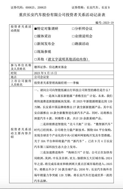 长安汽车向投资者介绍了公司向智能低碳出行科技公司转型的路径。