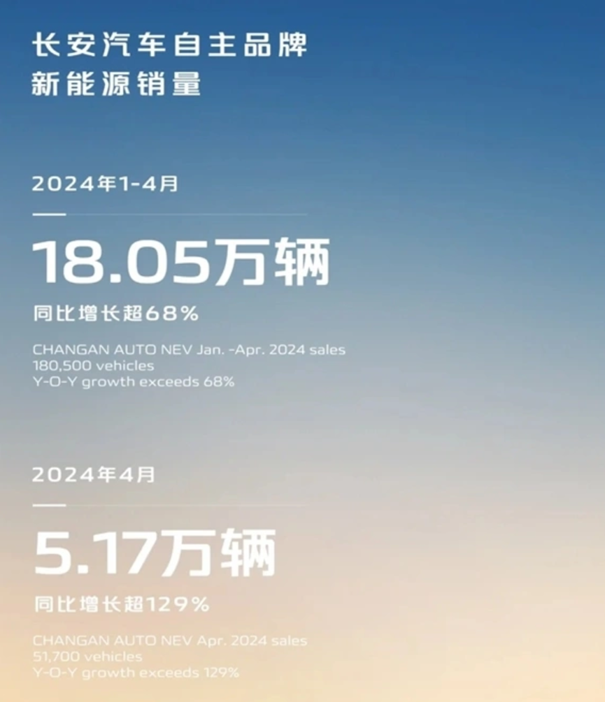 据统计,长安汽车在1至4月期间的销量共计达到了18.05万辆,同比增长超过68%。4月份,长安汽车的销量达5.17万辆,同比增长129%。