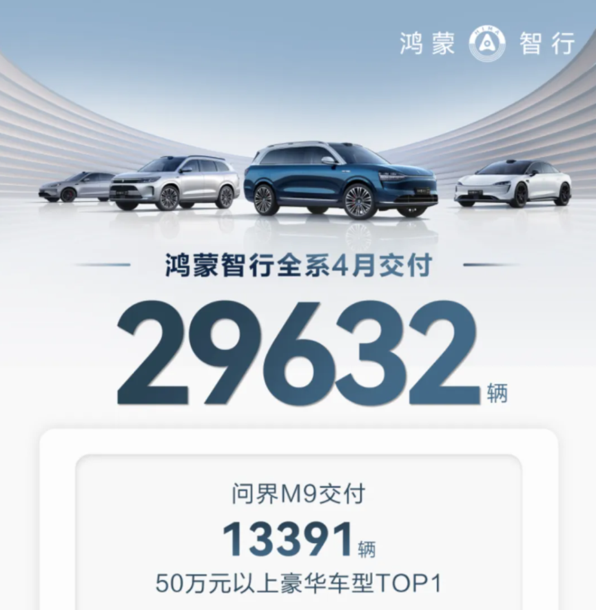 4月,鸿蒙智行全系交付新车29632辆,蝉联中国新势力品牌月销量冠军。