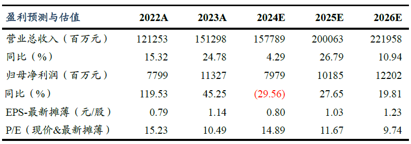我们维持公司2024-2026年盈利预测,营业收入为1578/2001/2220亿元,分别同比+4%/+27%/+11%,归母净利润为80/102/122亿元,分别同比-30%/+28%/+20%,对应EPS分别为0.80/1.03/1.23元,对应PE分别为15/12/10倍,维持“买入”评级。