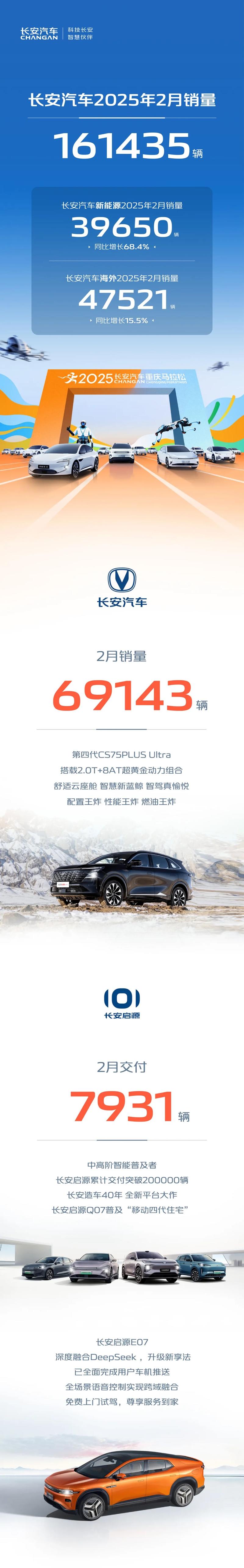 具体来看,长安汽车2月销量69143辆;长安启源2月交付7931辆;
