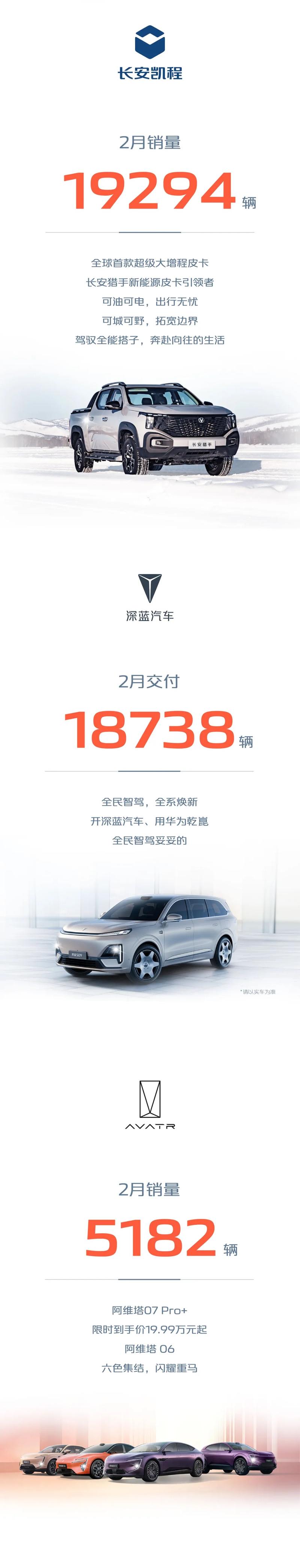 长安凯程2月销量19294辆;深蓝汽车2月交付18738辆;阿维塔2月销量5182辆;