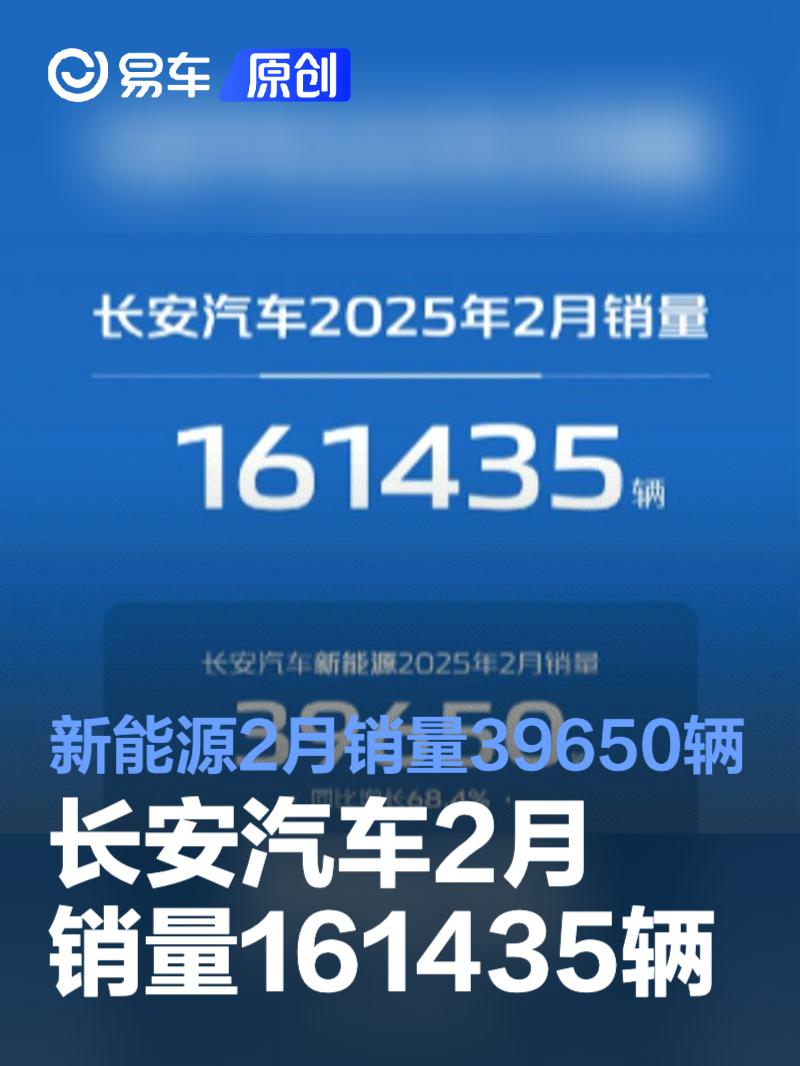易车讯日前,长安汽车公布最新销量数据。2025年2月,长安汽车销量161435辆,其中新能源2月销量39650辆,同比增长68.4%。