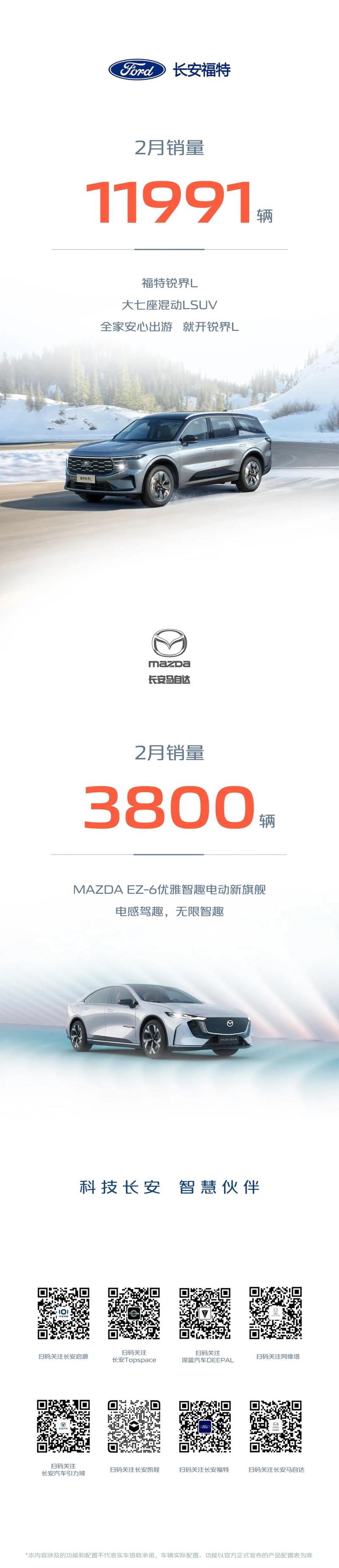 长安福特2月销量11991辆;长安马自达2月销量3800辆。