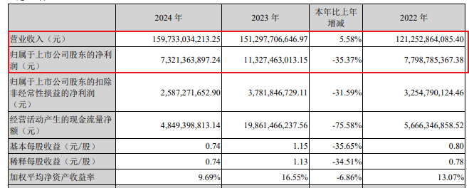 然而,归属于上市公司股东的净利润却为73.21亿元,同比下降35.37%;扣非归母净利润为25.87亿元,同比下降31.59%。