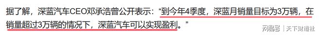 深蓝汽车CEO邓承浩曾提出,月销达到3万辆时有望实现盈利。然而,去年深蓝汽车单月最高销量曾达到3.6万辆,但距离盈利仍有一定距离。