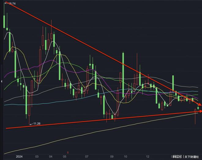 其股价走势图似乎也与此暗合。从2024年初至今,长安汽车股价一直在一个大的三角形中震荡。高点逐渐下降,但守住了底线,如今也逐渐走向变盘的十字路口。