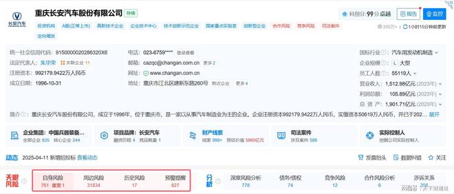 另据查询显示,长安汽车自身风险高达761余条,预警风险超过800条,周边风险更是高达31000条。