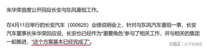 长安汽车董事长朱华荣在业绩说明会上透露,长安与东风的重组方案已基本完成。