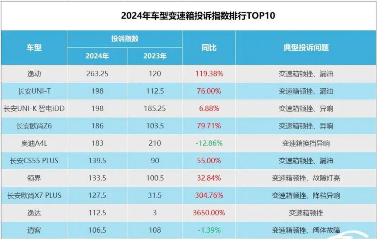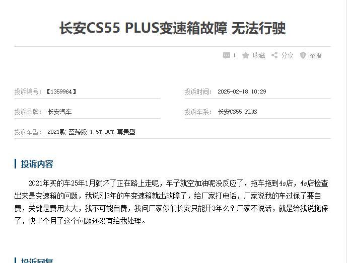 汽车门网数据显示,长安旗下多款车型占据变速箱投诉榜半壁江山,七档湿式双离合变速箱的设计缺陷集中爆发,车主投诉其变速箱存在低速顿挫、动力中断等常见频发问题。离合器片材质也存在不达标。面对问题,厂商消极应对,4S店以“正常现象”搪塞,拒绝对缺陷产品召回。