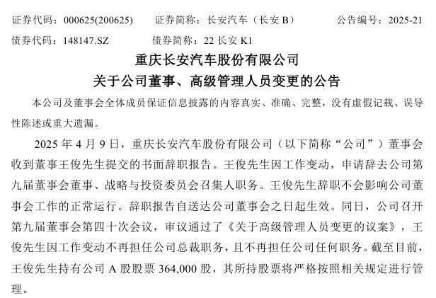 年报发布的同日,长安汽车还宣布了总裁王俊离任的消息。公告称,董事会收到董事王俊提交的书面辞职报告。王俊因工作变动,申请辞去公司第九届董事会董事、战略与投资委员会召集人职务,辞职报告自送达公司董事会之日起生效,王俊不再担任公司总裁职务。最新信息显示,王俊已转任中国兵器装备集团公司副总经理。