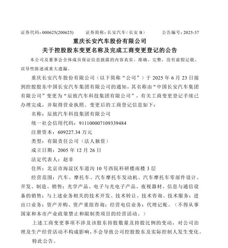 近日,长安汽车发布公告称,其控股股东"中国长安汽车集团有限公司"已完成工商变更登记,正式更名为"辰致汽车科技集团有限公司"。根据国家企业信用信息公示系统显示,新公司已取得更新后的营业执照。