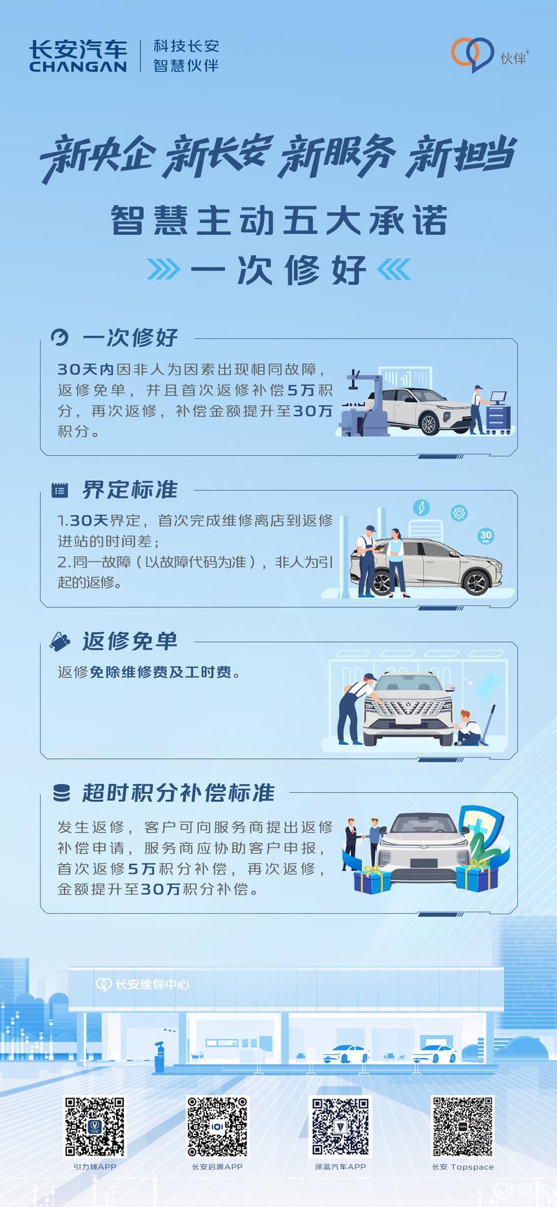 日前,长安汽车发布智慧主动五大承诺,拒绝维修拖延,超时必赔。24小时一般维修(含配件等待),超时日补1.2万积分,云图系统全程计时,维修透明。