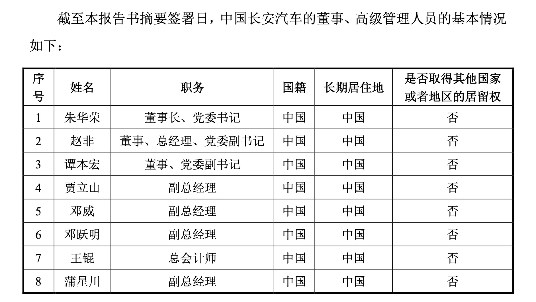 中国长安汽车高管团队人员主要来自旗下长安汽车、辰致集团等子公司。