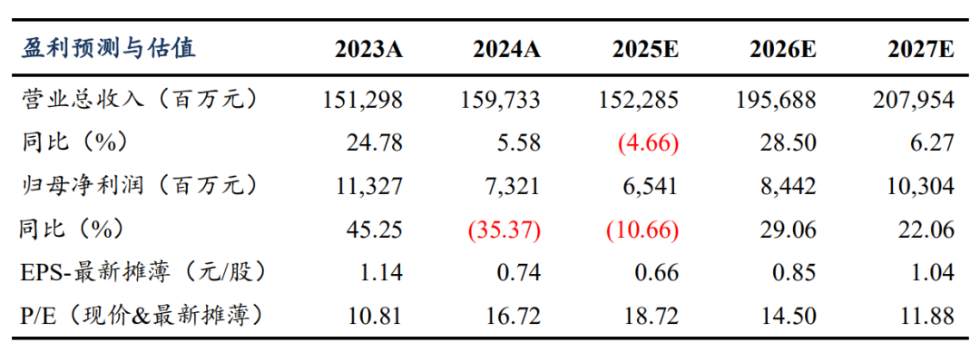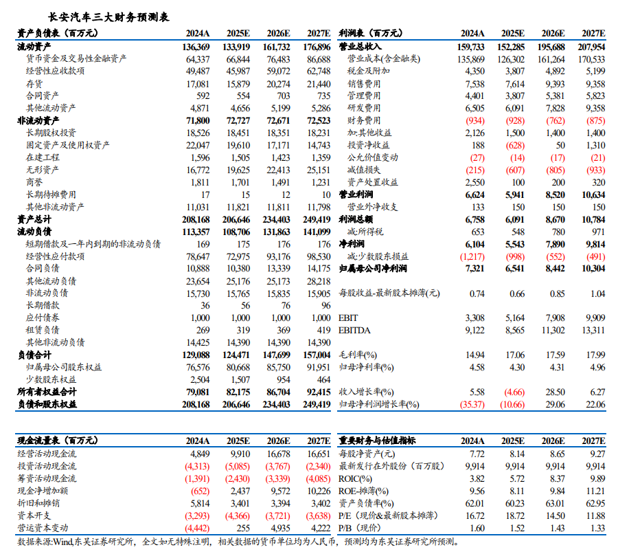 考虑行业竞争加剧以及公司销售费用率提升明显,我们下调公司2025/2026/2027年归母净利润至65.4/84.4/103.0亿元(原为87/95/109亿元),对应PE分别为19/15/12倍。考虑公司深蓝/阿维塔/启源三大品牌向上,智能化/全球化持续推进,我们仍维持长安汽车“买入”评级。