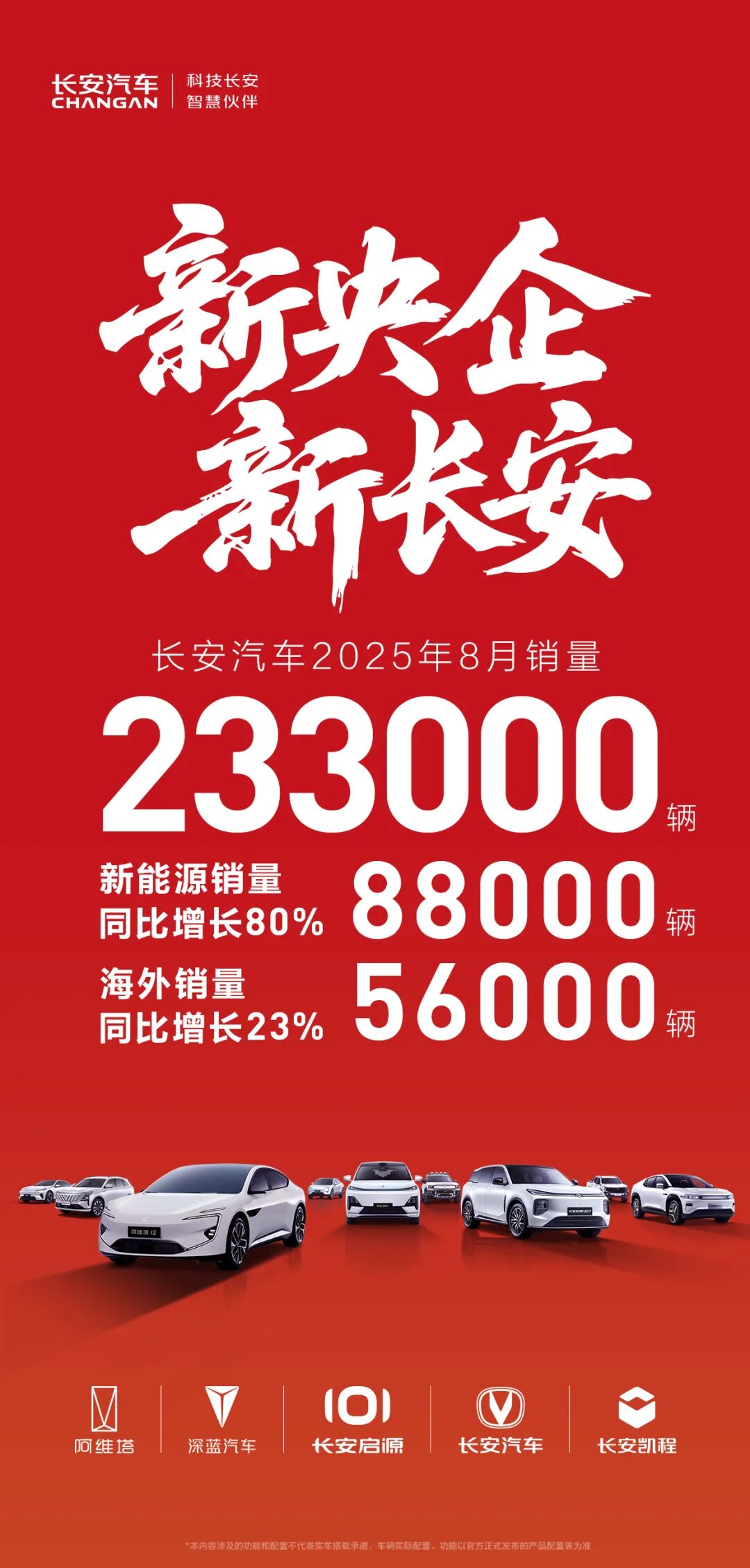 新央企,新长安丨长安汽车2025年8月销量23.3万辆,新能源销量8.8万辆,同比增长80%,海外销量5.6万辆,同比增长23%